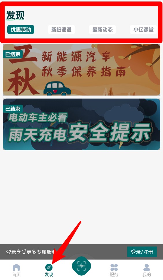 3、点击下方“发现”栏目,即可查看优惠活动、新能源资讯以及平台动态信息,从而掌握最新消息。