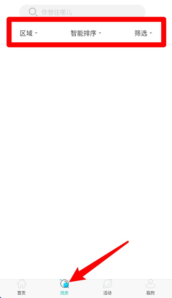 2、点击底部“找房”按钮,可浏览所有房源并支持区域、租金、户型等条件精准筛选。