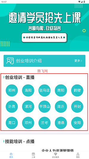 1、当用户进入云工社,于首页能够选择观看创业培训直播。
