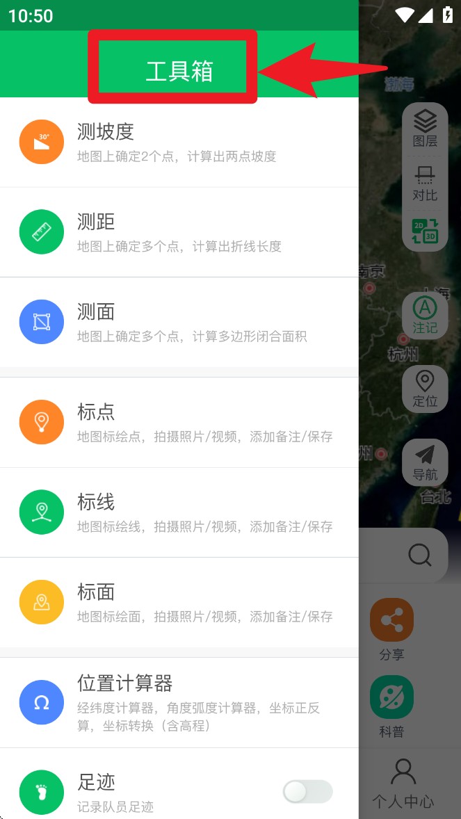 2. 于工具箱里点击「测坡度」或者「测距」等功能,能够直接在地图上选取点并获取结果。