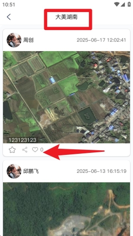 5. 点击进入「大美湖南」板块,在这里你能够浏览其他用户上传的遥感图片以及测绘成果,还可以通过点赞的方式与之互动。