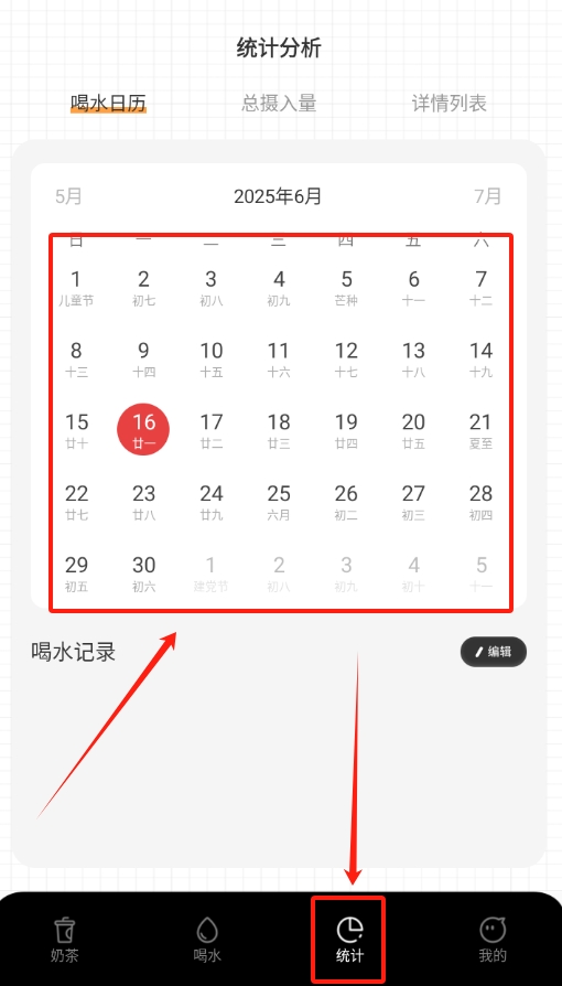 3、于统计分析页面,可查看清晰直观的喝水日历与报表,借此全面知悉总摄入量、奶茶杯数等关键信息。