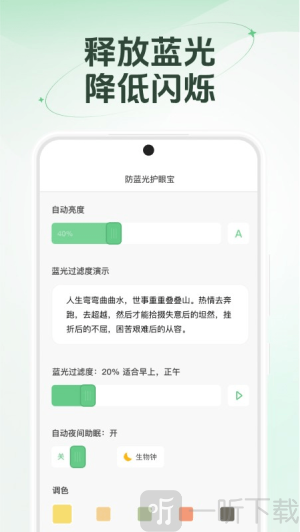 防蓝光护眼宝能够通过调控手机屏幕亮度、进行蓝光调节以及改变色调等途径,降低用户日常使用3C产品时对眼睛造成的损害。而且,该软件具备诸多实用且强大的功能,像用眼习惯分析、实时统计分析、一键开启防蓝光等,这些功能都能切实有效地呵护用户的眼睛。