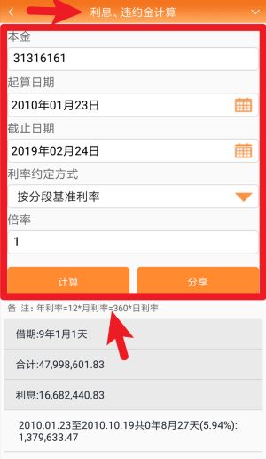 4、于利息违约金计算页面,输入本金以及起止日期,接着选择利率方式,随后点击“计算”按钮,即可查看结果。