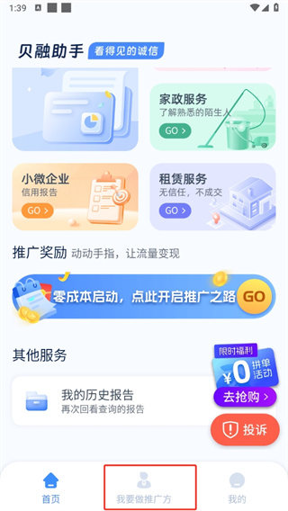 1、第一步,打开贝融助手软件,进入首页后,切换至【我要做推广方】。