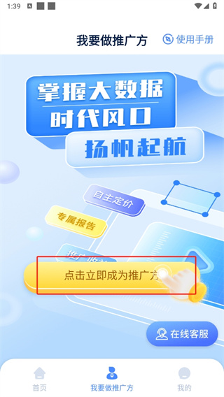 2、接着在“我要做推广方”的页面里,点击【立即成为推广方】。