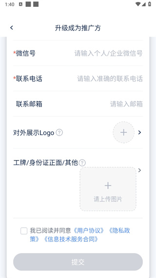 3、最后进入升级为推广方的页面,填好信息后点击【提交】即可。