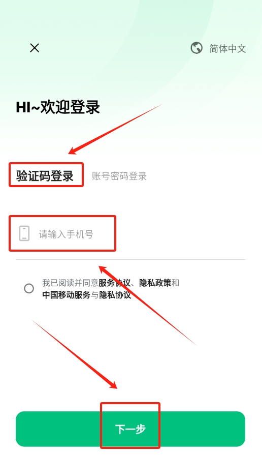 2. 通过验证码登录方式,先输入手机号以获取验证码,随后填写该验证码,即可登录系统并开始使用。