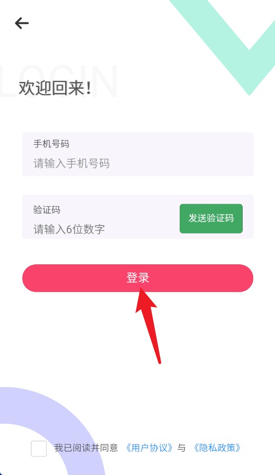 1、在登录界面,输入手机号与验证码,随后点击粉红色按钮,即可完成登录,操作简便快捷,无需繁琐流程。