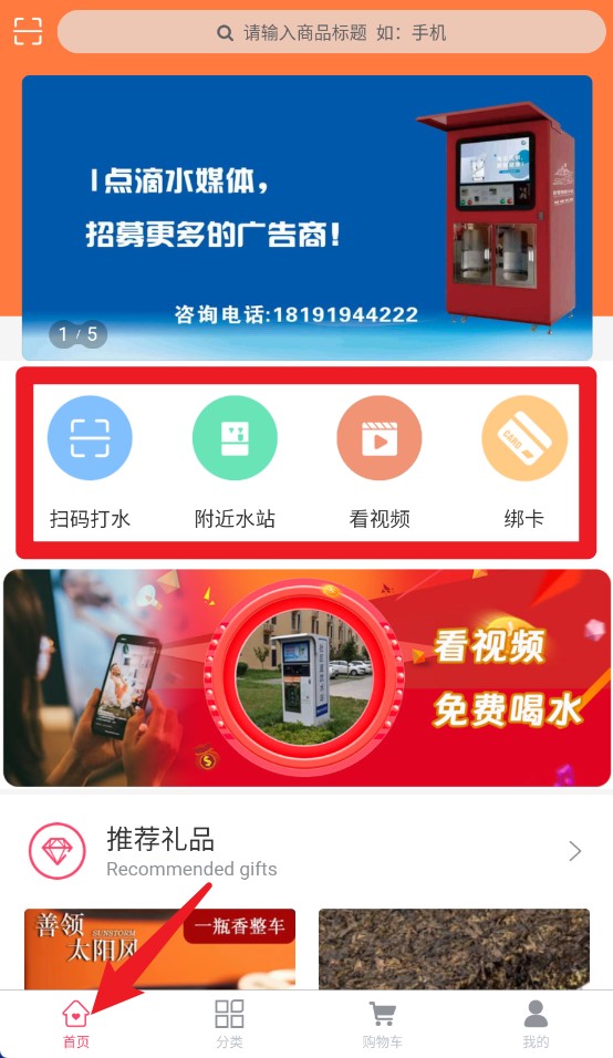 2. 首页设有扫码打水、附近水站等功能区域,用户通过一键操作,即可满足基本用水及娱乐需求。