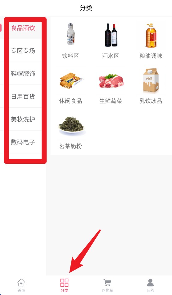 3、轻点底部的“分类”图标,就能查看商品类别,其范围覆盖食品饮料、美妆日用、数码电子等众多领域。