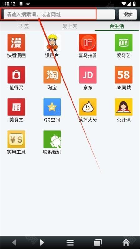 1. 首先安装软件,待进入首页后,点击页面上方的搜索框,在其中输入关键词或者网址,便能快速获取所需内容。