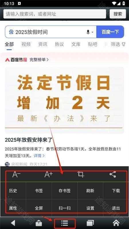 2. 轻点下方的三条横线按钮,进入菜单功能栏,在这里你不仅能够查看历史浏览记录,还能对网页字体大小等进行设置。