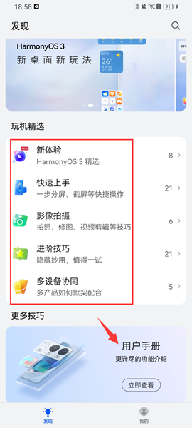 1、点击进入玩机技巧软件,在发现栏目中,有丰富的电子说明书、玩机精选推荐以及用户手册等内容。