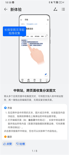 3、点击“新体验”,这里会教大家怎样在多个应用中收集图文,把图文拖入中转站暂时存放,随后一键拖到编辑页面,无需反复切换页面。