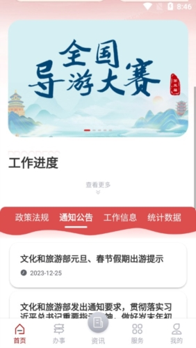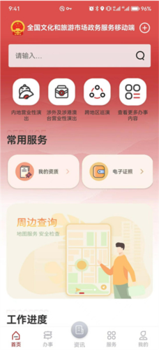 文旅市场通是一款由中华人民共和国文化和旅游部开发的旅游服务软件,它是专门面向国家文化领域及广大旅游部门打造的移动端政务软件。其目的在于助力文旅局部门更高效地完成文旅日常政务工作。在文旅市场通软件中,涵盖了政策资讯发布、行政审批办理、在线培训学习、电子证照应用等服务事项,同时为用户提供办理营业性演出、跨地区巡演等业务的入口,以及查询通知公告、办事进度等服务功能。
