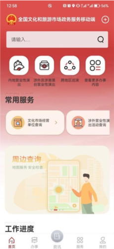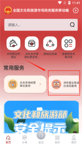 1、用户登录并打开应用后,首先进入首页,在常用服务里找到“涉外营业性演出活动查询”。