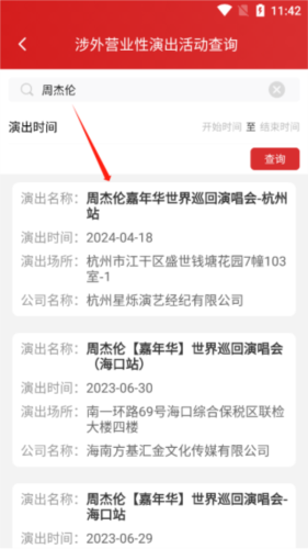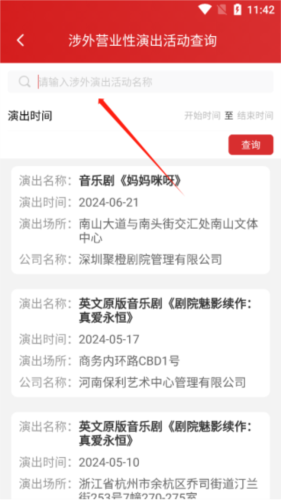 2、进入后,既能查询某一时间段内的演出名称、演出场所及时间,还能在搜索栏中搜索演出活动的名称。