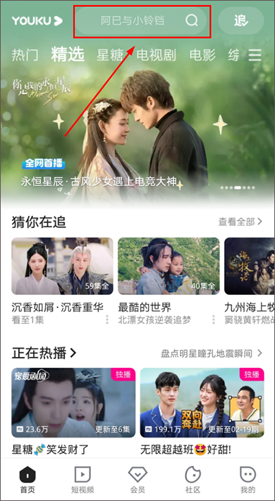 1. 打开优酷视频并登录,在首页找到搜索栏,点击后查找你想看的电视剧。