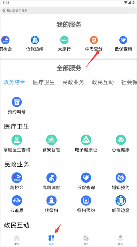 1、打开最新版本的“我的太原”,点击服务板块中的中考查分。