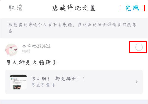 4、接下来,挑选你打算隐藏的评论,选中它,再点击上方的“完成”按钮就可以了。