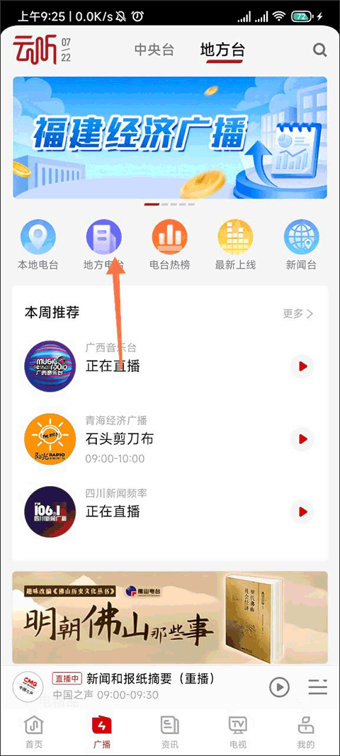 首先,我们进入广播界面,然后在该页面上找寻地方电台,找到后点击进入。
