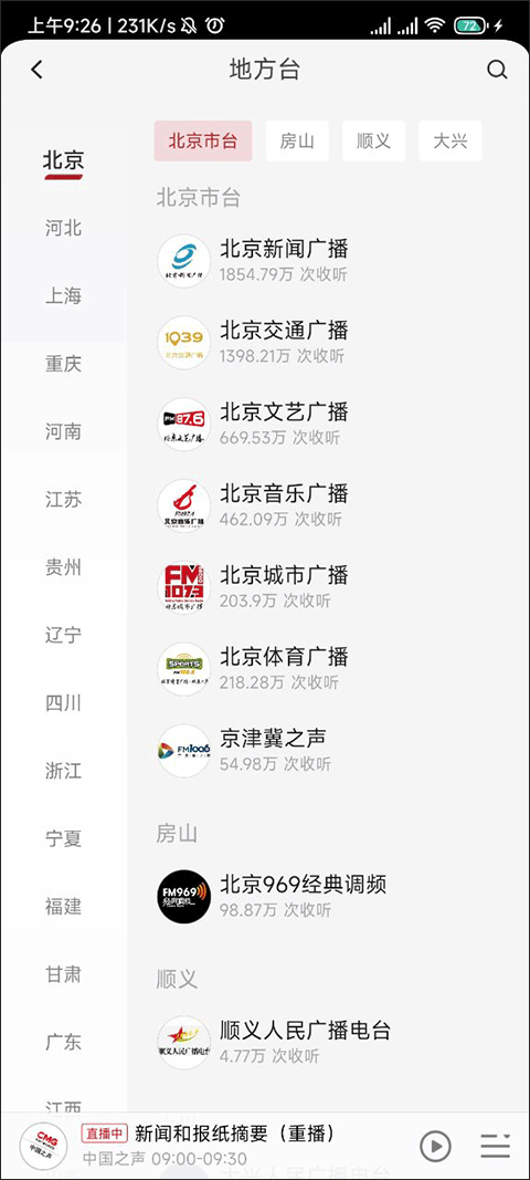 此时,我们能在左侧看到各个地区,只需点击一下,就能在左侧看到当地所有的电台。
