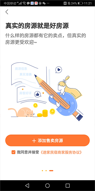 2、接下来,在浏览完相关介绍后,便可勾选商家服务协议,随后点击【添加售卖房源】。