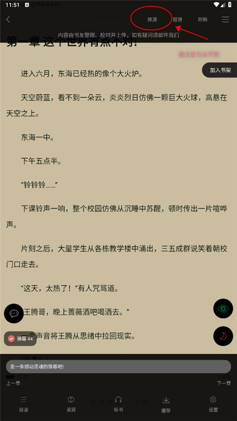 2. 进入之后,点击屏幕中部,菜单栏便会出现,接着在右上角位置点击换源。