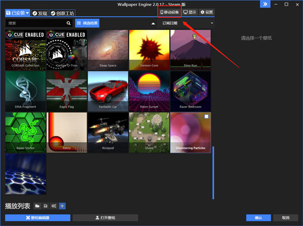 1. 在Windows系统的壁纸引擎(Wallpaper Engine)里,点击新的移动设备按钮,接着选择连接新设备。