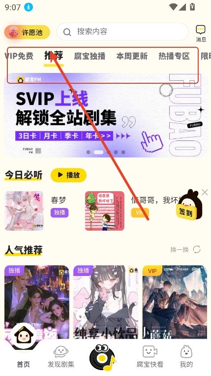 1、进入腐宝FM首页,筛选喜欢收听的有声频道