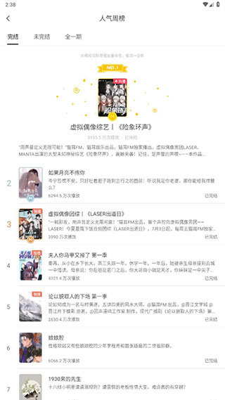 2、进入广播剧单元,这里有推荐、玩家、未完结、全一期等板块供用户选择