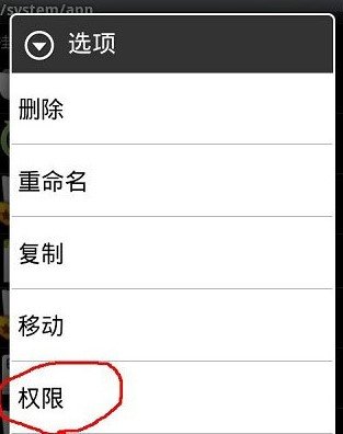 第六步、要删除哪个文件,就在该文件上长按,会出现“选项”,选择“权限”。