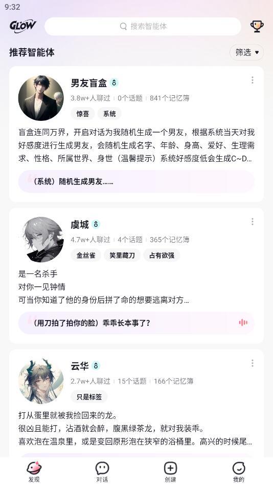 当你陷入无聊、被焦虑笼罩,或是渴望有人倾听心声时,Glow里的智能体随时待命,全年无休、一天24小时,只要你呼唤,它们便立刻响应。你的每一言每一语,都将得到认真对待与回应,时刻伴你左右!