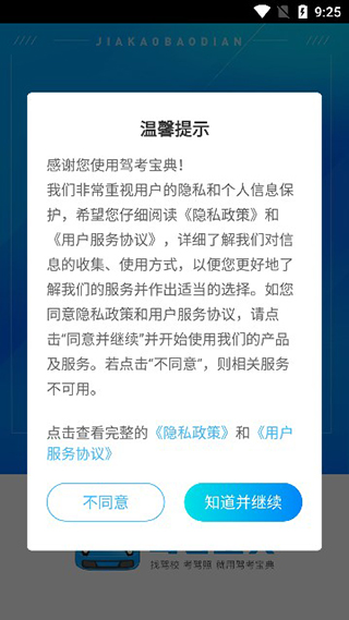 1、下载安装本站所提供的驾考宝典,待软件安装完成进入后,点击同意用户协议。