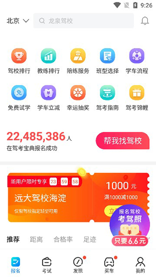 3、主界面具备丰富功能,涵盖驾校排行、教练排行、班型选择等。