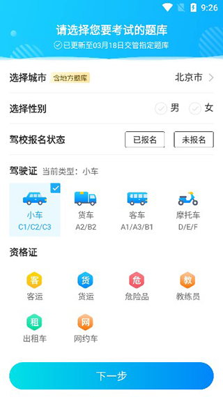 2、接下来选取需要考试的题库、性别以及驾校报名状态。