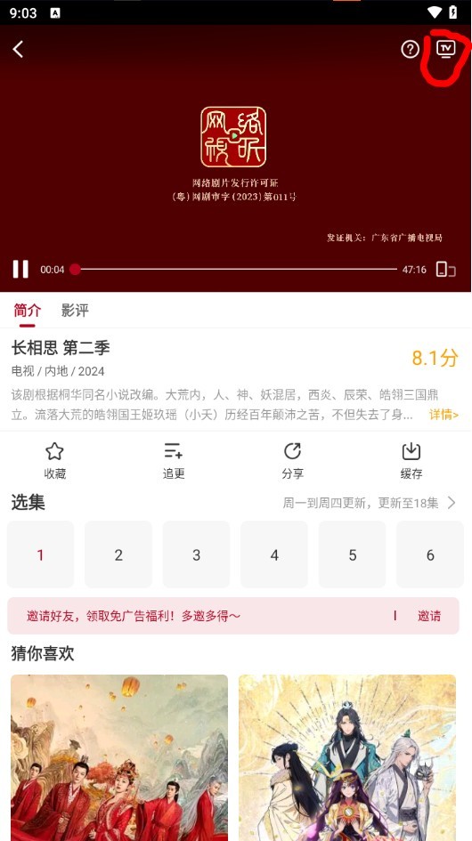 1、依旧是进入影视播放页面,接着点击页面上方的“TV”投屏标识。