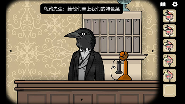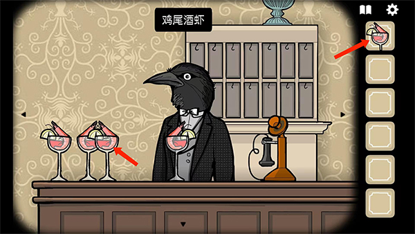 3、点击前台摆放的鸡尾酒,依次把它们拿走,这时前台的乌鸦会说道:给他们呈上我们的特色菜。