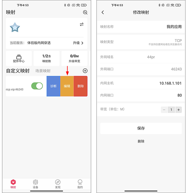 点击“编辑”,可对映射的应用名称、内网主机IP、内网端口以及带宽等参数进行修改。